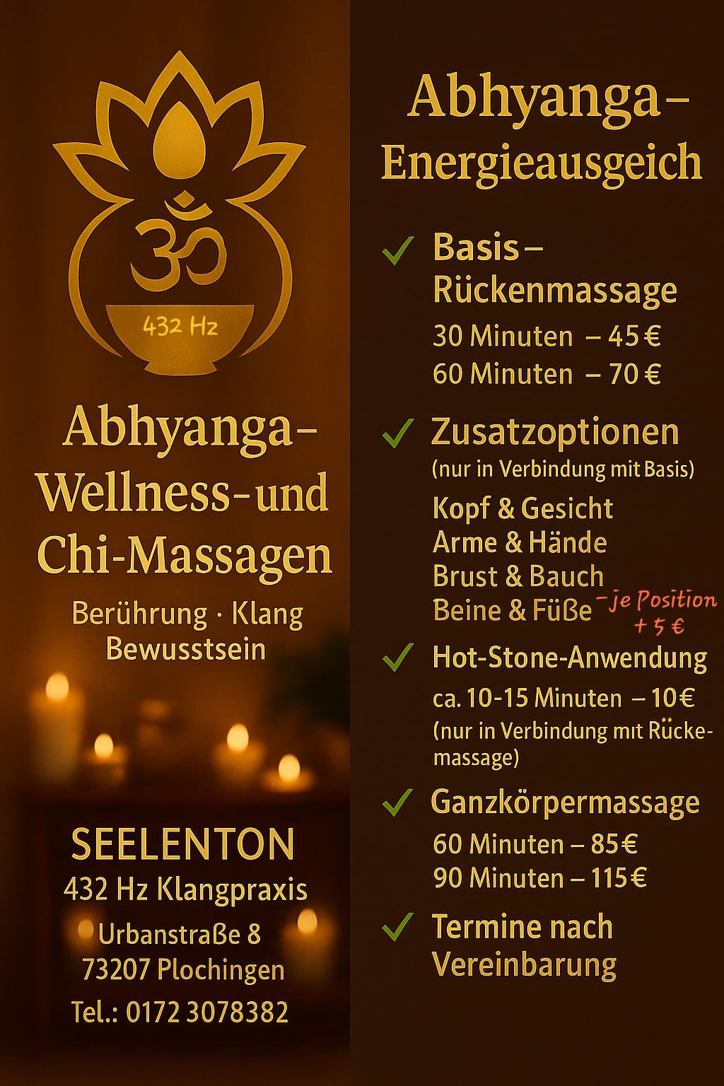 Mit hochwertigen Ölen, sanften Streichungen und harmonischer Energiearbeit – begleitet von natürlichen 432 Hz-Klängen – werden Verspannungen gelöst, die Durchblutung angeregt und tiefe innere Ruhe erfahrbar.